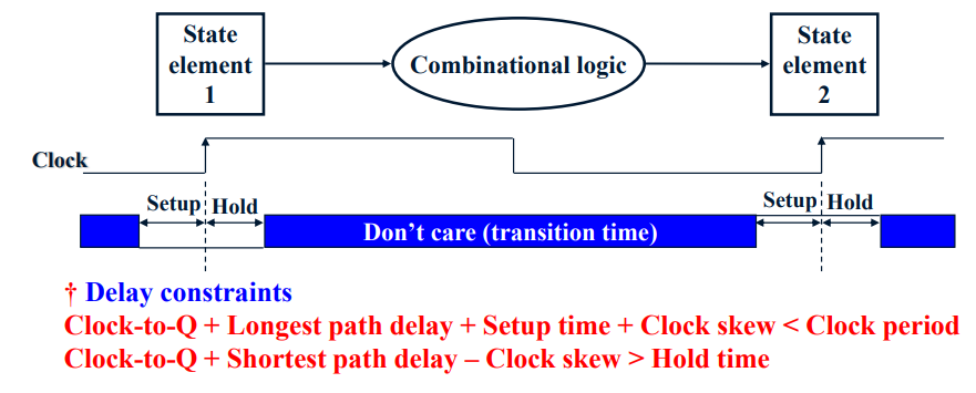 Hold time : state elements 로의 입력 클락엣지 이후에도 hold time 동안 valid 해야한다.
