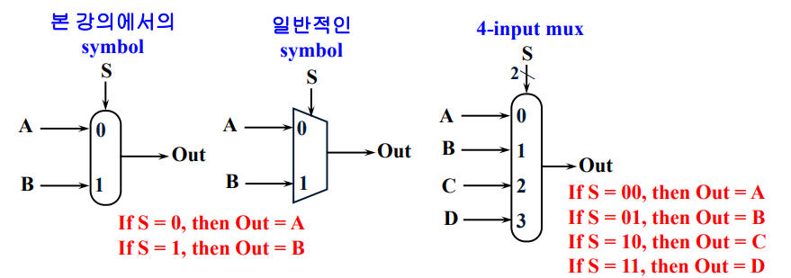 여러 input들 중 Control signal 에 따라 1개를 output 으로 내보냄, Selector 라고도 함.