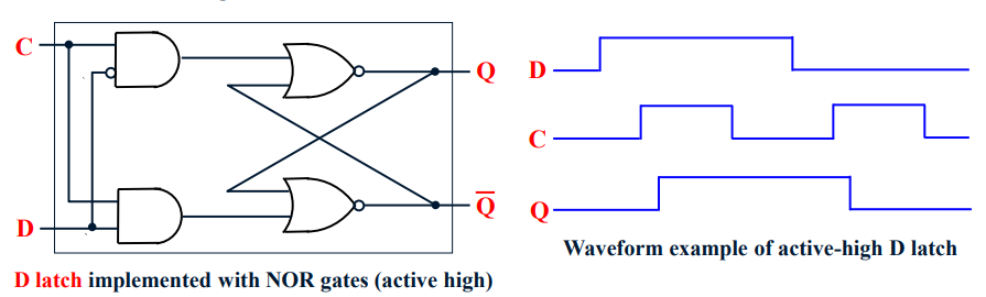 D-latch : Clock 이 asserted 되어있는 동안에 input signal의 값을 내부 state 에 저장하는 latch. ( 특정조건이 만족할경우에만 state change 가 일어난다면, write enable 로 사용되는 control signals 가 존재한다.)