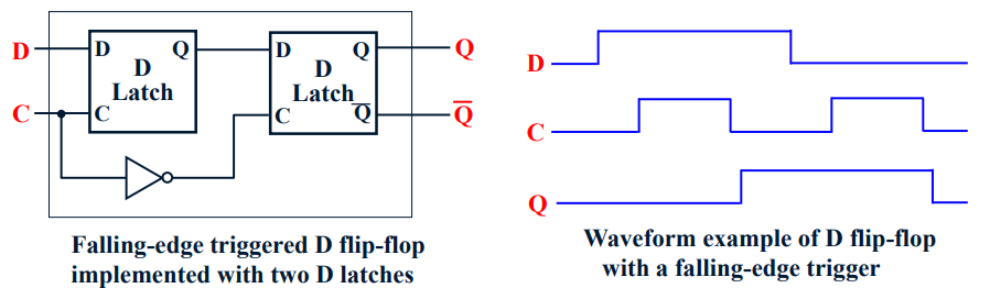 - Edge-triggered : state change 가 clock edge 에서 이루어지고 Rising edge 또는 Falling edge 를 사용하게 된다.