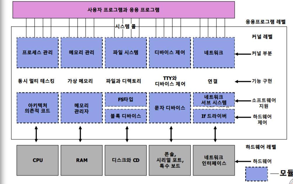 Monolithic 구조는 os의 커널이 시스템상 필요한 모든 기능을 갖추고 있다. 고전 UNIX시스템에 해당한다.